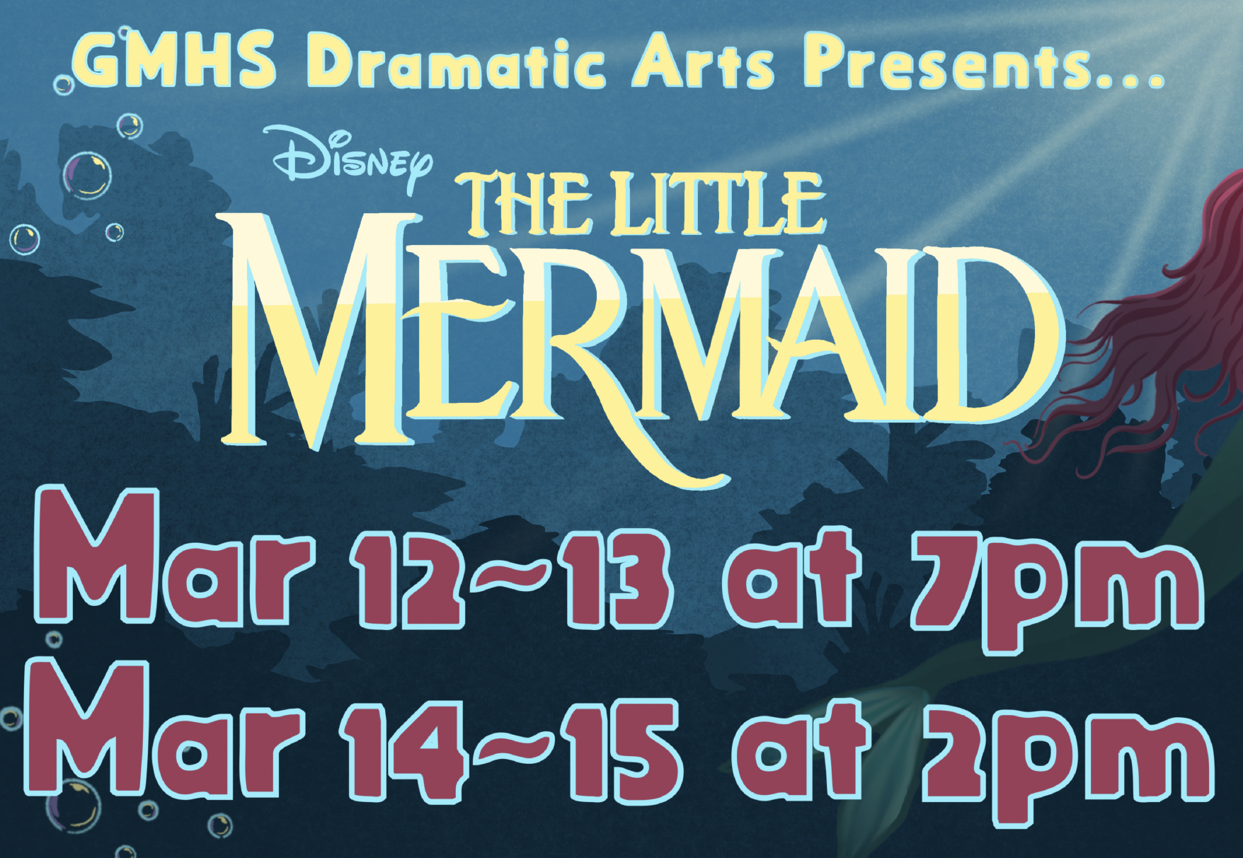 Disney’s The Little Mermaid is presented through special arrangement with Music Theatre International (MTI). All authorized performance materials are also supplied by MTI. www.mtishows.com